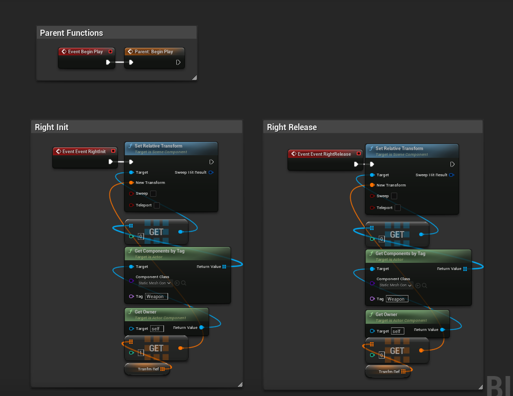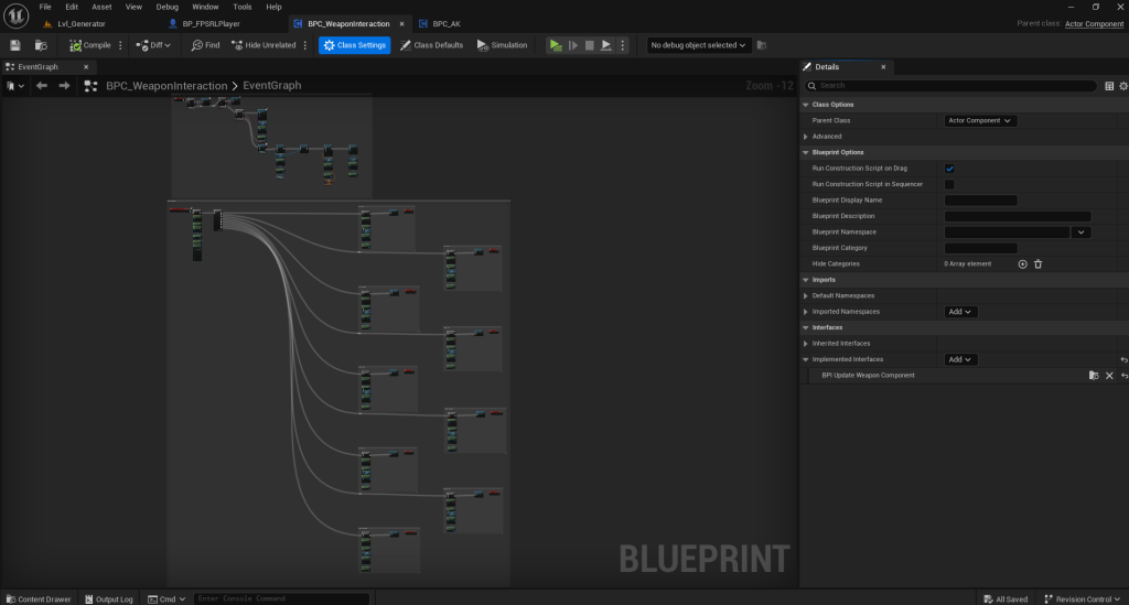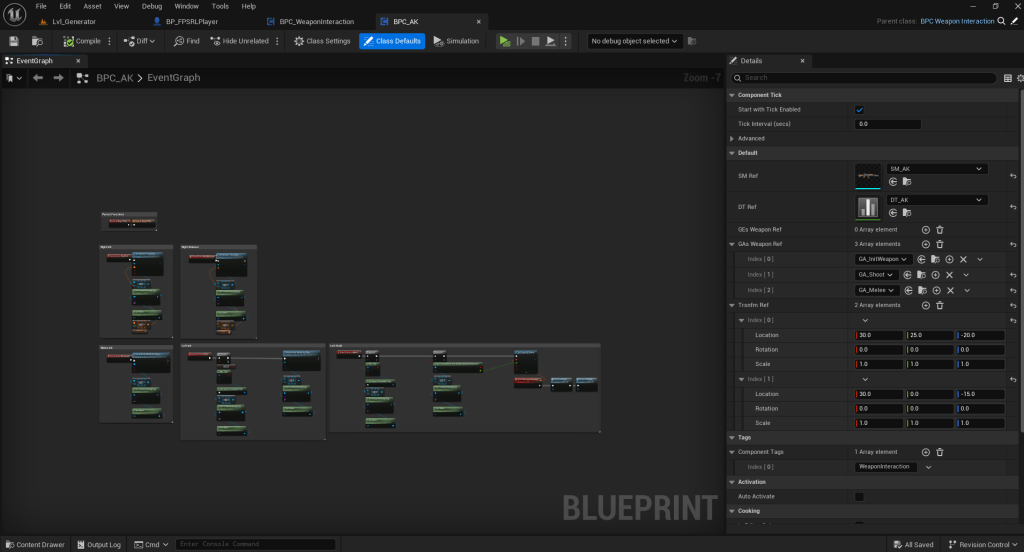 This workflow was created as a result of the interaction system previously mentionned. It allows full creation and customization of any weapon as a component that can be attached to any character in the game. The weapon will provide stats for the weapon and the action it can take to the parent character it is attached.