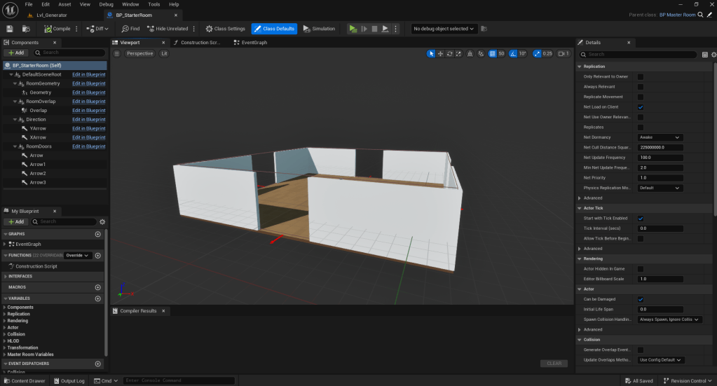 The design for the room generator is fairly simple. It uses a multitude of blueprint components to generate rooms and the gameplay logic.