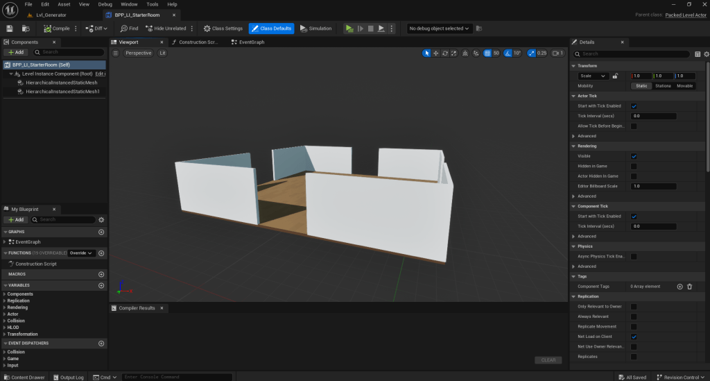 This workflow was created during the second week to test basic layout and generation logic. As I was a strong advocate of loading all the geometry of the room at once to reduce performance issues later, I created a workflow that used PLA’s instead of placing all the static meshes into a blueprint. Using PLA, this also meant a level designer could implement a room in under 5 minutes using components in a child blueprint of a parent blueprint.